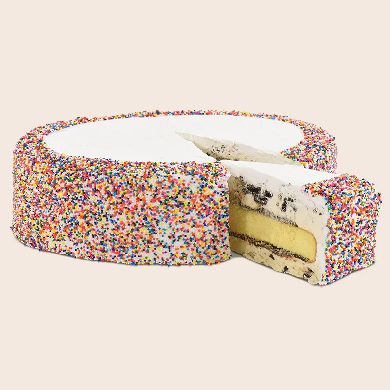 Real baked yellow cake is surrounded by layers of Kilwins® Original Recipe Cookies & Cream and Chocolate Chip Cookie Dough Ice Cream, covered in Kilwins® Hot Fudge Topping. We finish the cake with smooth, creamy vanilla frosting, then decorate it with colorful sprinkles!