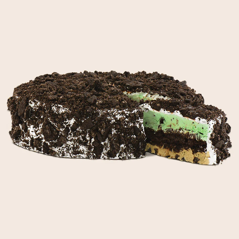 Real baked dark chocolate cake is surrounded by layers of our Original Recipe Mint Chocolate Chip & Cappuccino Chocolate Chip Ice Cream, covered with Kilwins® Hot Fudge Topping. We finish the cake with creamy vanilla frosting, then cover it with OREO® Cookie pieces.