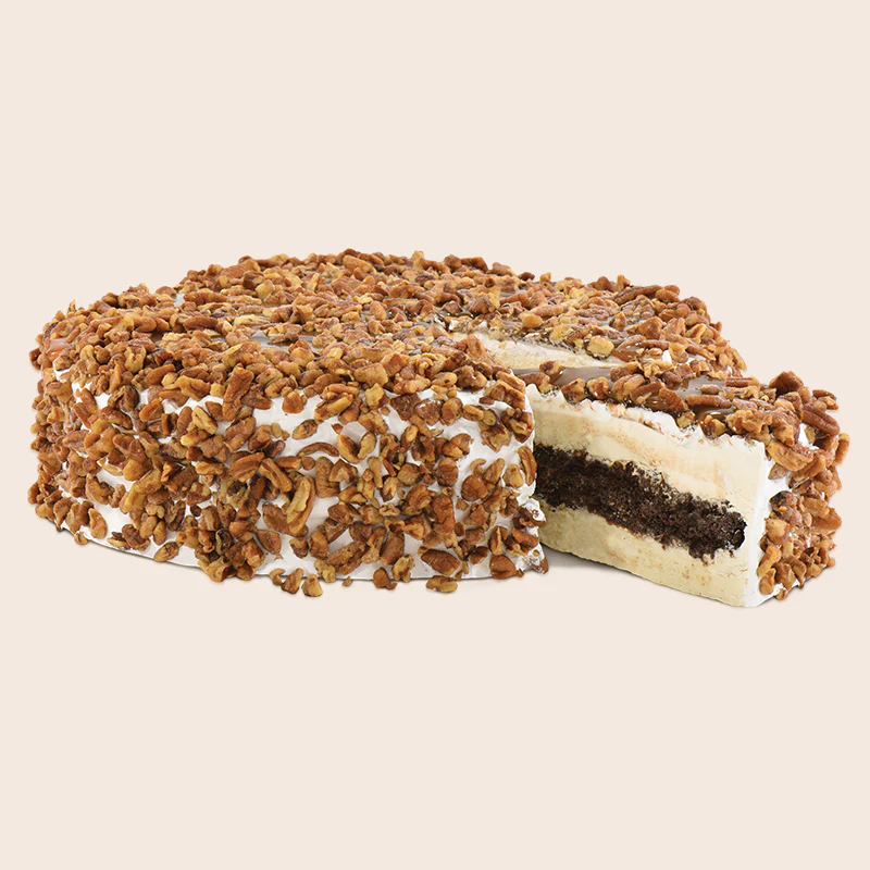 An Ice Cream Cake spin on a classic turtle! A real baked dark chocolate cake is sandwiched between two layers of Kilwins® Original Recipe Old Fashioned Vanilla Ice Cream, then layered with delicious Kilwins® Caramel & Hot Fudge Toppings. We frost it with creamy vanilla frosting, add another layer of our Hot Fudge & Caramel Toppings, then cover it generously with tender pecan pieces.